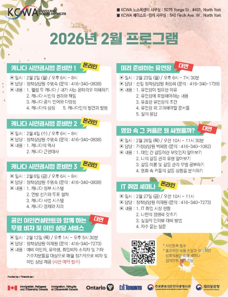 ‘정신과 전문의와 함께하는 청소년 정신건강 이야기’ ‘온타리오 가정법 알아보기’ ‘사회초년생을 위한 온타리오 고용 기준법’ ‘캐나다시민권 시험 온라인 연습반’ ‘영주권 카드 갱신 신청’ 등 알찬 프로그램으로 가득 합니다.
