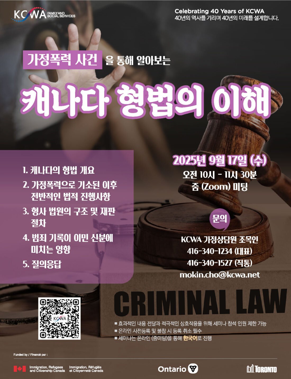 KCWA의 '가정폭력 사건을 통해 알아보는 캐나다 형법의 이해' 세미나가 9월 17일 (수) 오전 10시부터 줌 (Zoom) 미팅을 통해 열립니다. 이번 세미나에서는 캐나다의 형법에 대해 살펴보고, 특히 가정폭력으로 기소된 이후 법적인 진행사항과 범죄 기록이 이민 신분에 미치는 영향 등에 대한 정보를 제공합니다. 관심 있는 분은 아래 링크를 통해