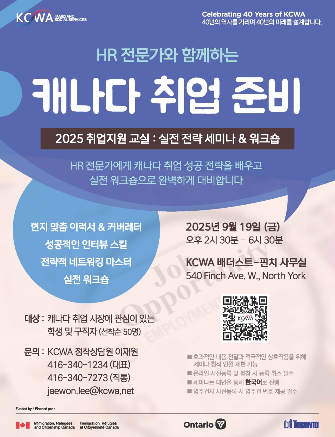 KCWA는 취업을 준비하시는 분들을 위해 9월 19일 (금) 오후 2시 30분부터 'HR 전문가와 함께하는 캐나다 취업 준비' 세미나를 대면으로 진행합니다. 일시 : 9월 19일 (금) 오후 2시 30분 - 6시 30분 장소 : KCWA 배더스트-핀치 사무실 (540 Finch Ave. W., North York) 이번 세미나에서는 이력서 & 커버레터 작성법,