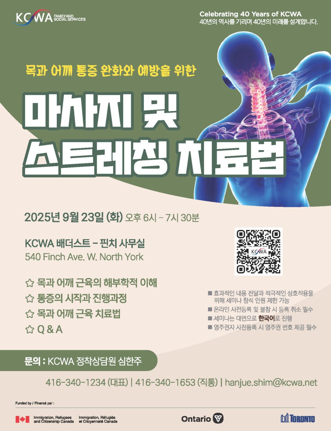 목과 어깨 통증은 잘못된 자세, 스트레스, 목 디스크, 어깨 질환 등이 원인일 수 있습니다. 올바른 자세 유지와 함께 꾸준한 스트레칭이 도움이 될 수 있습니다. KCWA는 9월 23일 (화) 오후 6시부터 '목과 어깨 통증 완화와 예방을 위한 마사지 및 스트레칭 치료법' 세미나를 대면으로 진행합니다. 일시 : 9월 23일