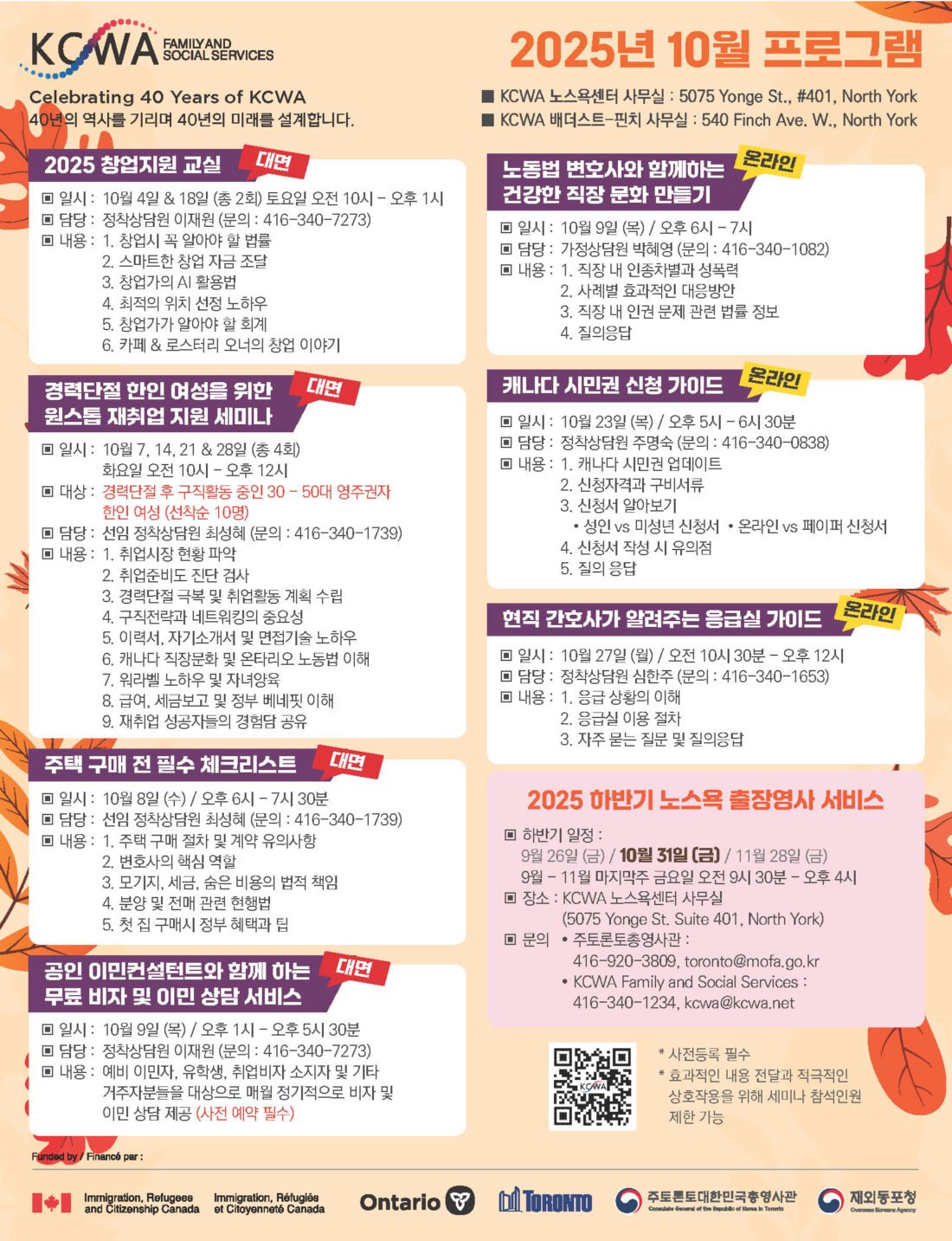 계절의 변화가 곳곳에서 느껴지는 9월 중순입니다. 풍성하고 여유로운 계절이 되시기를 바라면서 KCWA의 10월 프로그램을 소개합니다. 🎯2025 창업지원 교실 10월 4일 & 18일 (총 2회) 토요일 오전 10시 - 오후 1시 🎯경력단절 한인 여성을 위한 원스톱 재취업 지원 세미나 10월 7, 14, 21 & 28일 (총 4회) 화요일 오전 10시 - 오후