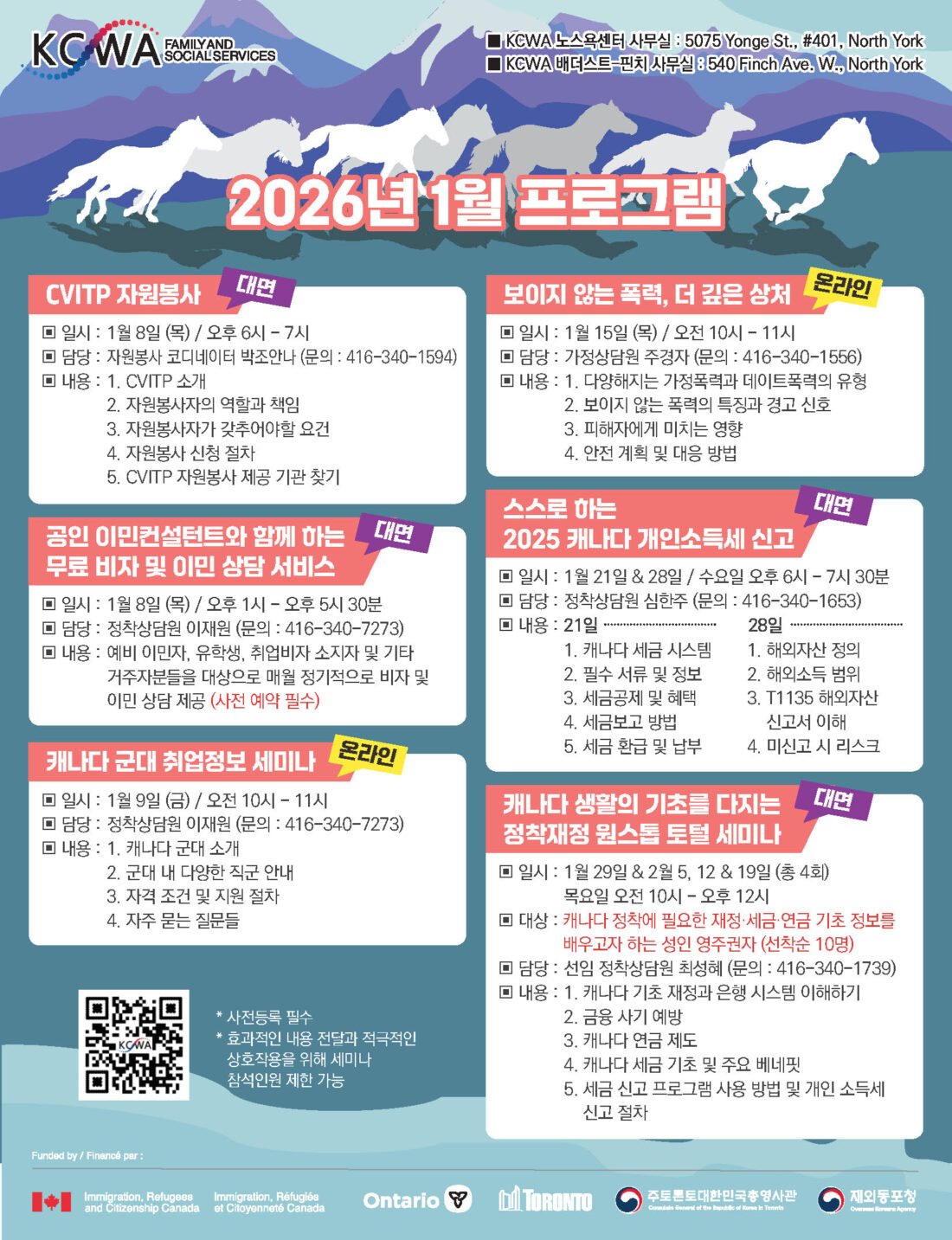 어느덧 2025년 한 해가 저물어갑니다. 올 한 해도 수고 많이 하셨습니다. 새롭게 밝아오는 2026년에는 더 큰 성장과 행복이 함께하길 기원합니다. KCWA의 2026년 1월 프로그램을 소개합니다. ✨CVITP 자원봉사 - 대면 1월 8일 (목) / 오후 6시 - 7시 ✨공인 이민컨설턴트와 함께 하는 무료 비자 및 이민 상담 서비스 - 대면 1월 8일 (목)
