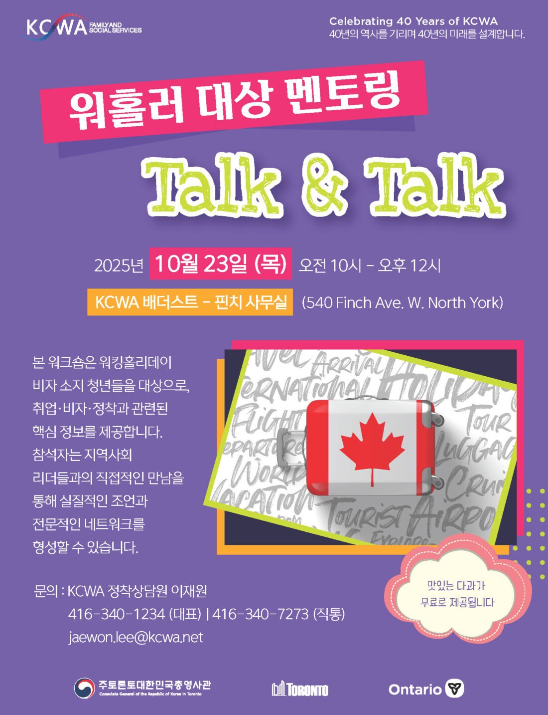 비영리단체 KCWA Family and Social Services에서 워킹홀리데이 비자를 소지한 분들을 대상으로 '워홀러 대상 멘토링 Talk & Talk' 워크숍을 진행합니다. 일시 : 2025년 10월 23일 (목) 오전 10시 -오후 12시 장소 : KCWA 배더스트 -핀치 사무실 (540 Finch Ave. W., North York) 이번 워크숍은 워홀러들에게 취업, 비자 및 정착과