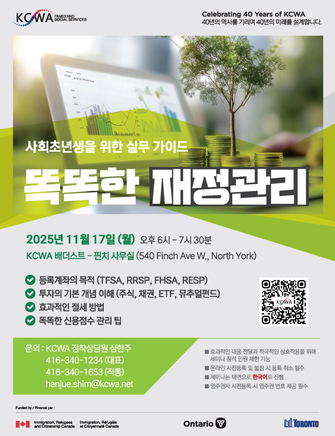 KCWA의 '사회초년생을 위한 실무 가이드: 똑똑한 재정관리' 세미나가 11월 17일 (월) 오후 6시부터 KCWA 배더스트-핀치 사무실 (540 Finch Ave. W., North York) 에서 대면으로 진행됩니다. 이번 세미나에서는 투자의 기본 개념부터 TFSA, RRSP, FHSA, RESP 등 등록계좌(Registered Account)의 목적, 효과적인 절세 방법, 신용점수 관리 팀 등에 대한