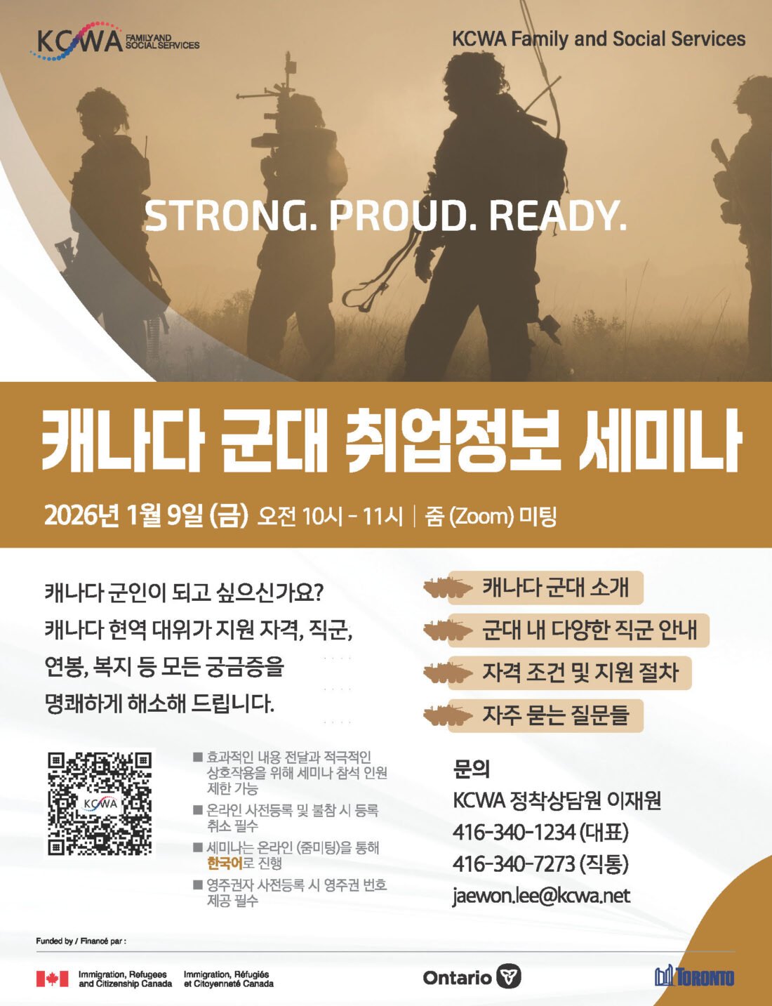 KCWA는 1월 9일 (금) 오전 10시부터 줌 (Zoom) 미팅을 통해 ‘캐나다 군대 취업정보 세미나’를 진행할 예정입니다.