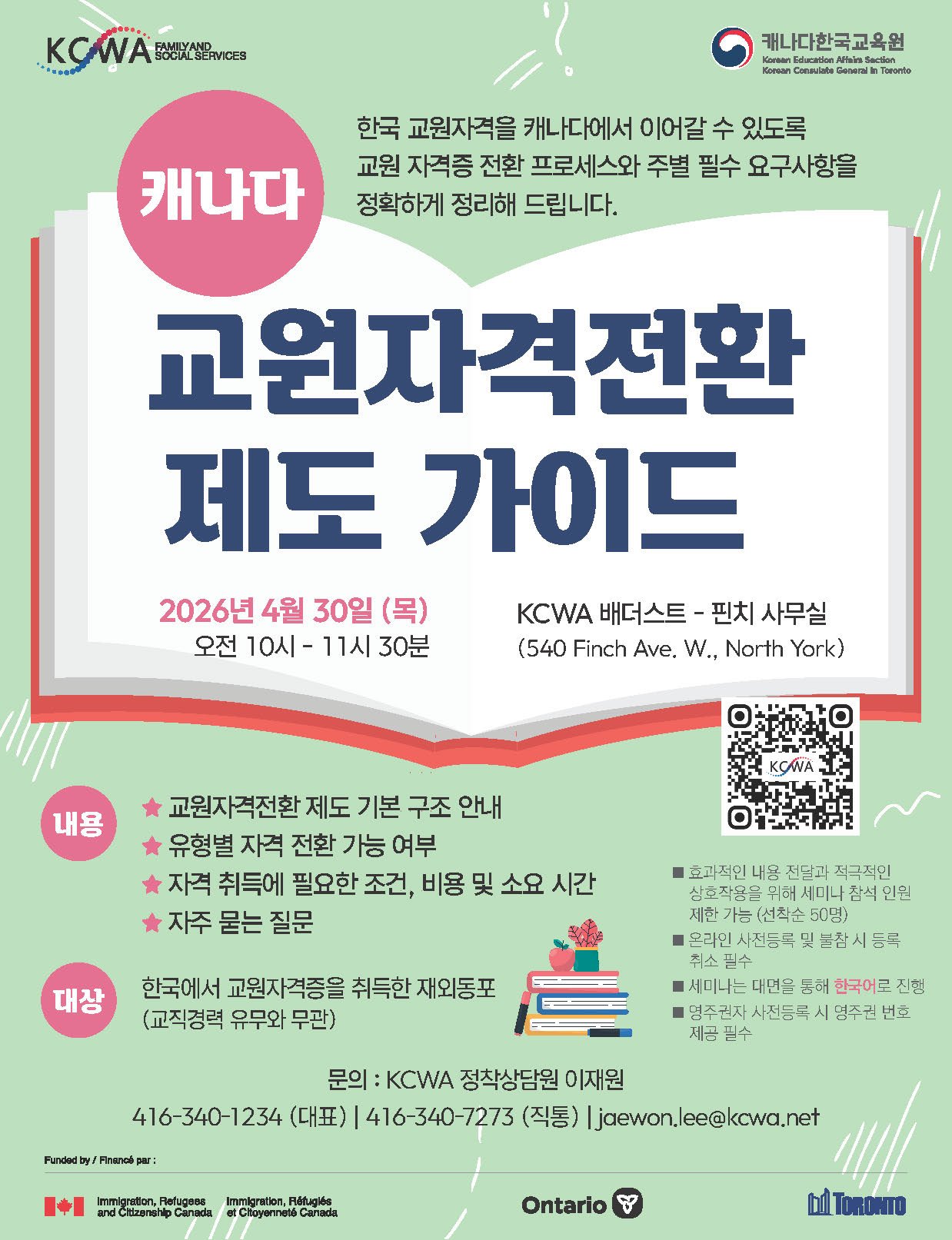 📢 한국 교원자격증, 캐나다에서도 이어가세요! 한국에서 교원자격증을 취득하셨나요? 캐나다에서 교사의 꿈을 계속 이어가고 싶으신 분들을 위해 캐나다 교원자격전환 제도 가이드 세미나가 열립니다! 🍎 📅 2026년 4월 30일 (목)