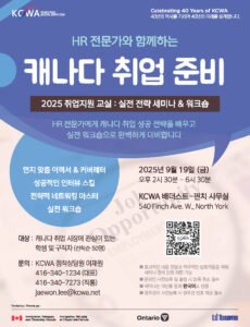 KCWA는 취업을 준비하시는 분들을 위해 9월 19일 (금) 오후 2시 30분부터 'HR 전문가와 함께하는 캐나다 취업 준비' 세미나를 대면으로 진행합니다.