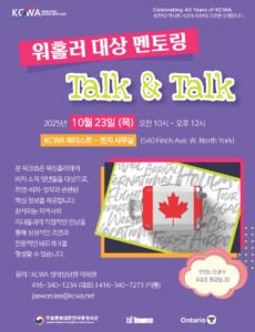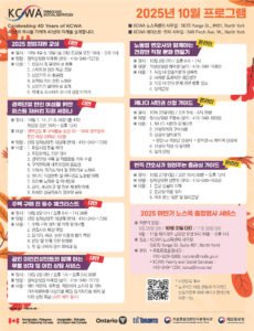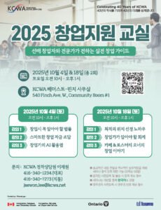 KCWA의 '2025 창업지원 교실'이 10월 4일 (토)과 18일 (토) 2회에 걸쳐 대면으로 진행됩니다. 세미나는 KCWA 배더스트-핀치 사무실이 위치한 540 Finch