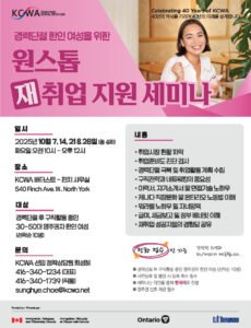 KCWA는 영주권을 받고 캐나다에 오신 후 육아나 여러가지 상황 때문에 경력이 단절된 한인여성들을 대상으로 '원스톱 재취업 지원 세미나'를 4회에 걸쳐