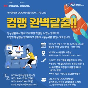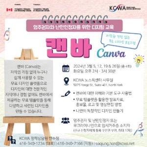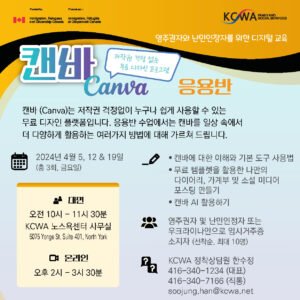 KCWA에서는 저작권 걱정 없는 무료 디자인 프로그램 '캔바 (Canva) 응용반' 강좌를 4월 5일 (금) 오전 10시부터 KCWA 노스욕센터 사무실 (5075