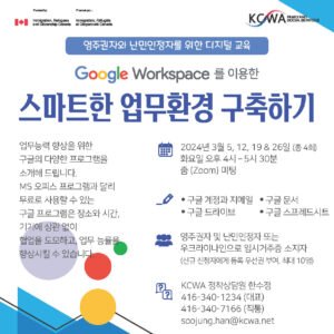 KCWA는 '구글 워크스페이스를 이용한 스마트한 업무환경 구축하기' 강좌를 3월 5일 (화) 오후 4시부터 줌 (Zoom) 미팅을 통해 진행합니다. MS 오피스와
