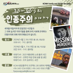 KCWA는 세계를 떠들썩하게 만들었던 사건들과 그 뒤에 숨겨진 이야기들을 통해 우리 사회에 존재하는 인종주의에 대해 이야기해보고자 합니다. 4월 2, 9