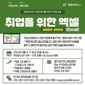 KCWA는 '취업을 위한 엑셀 (Excel) - 입문반' 강좌를 4월 4일 (목) 오전 10시부터 총 4회에 걸쳐 줌 (Zoom) 미팅을 통해