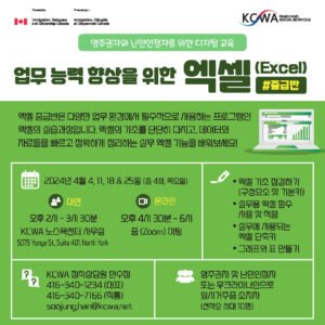KCWA에서는 '업무 능력 향상을 위한 엑셀 (Excel) - 중급반' 강좌를 4월 4일 (목) 오후 2시부터 총 4회에 걸쳐 KCWA 노스욕센터