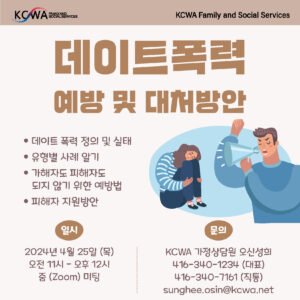 KCWA에서는 '데이트폭력 예방 및 대처방안' 세미나를 4월 25일 (목) 오전 11시부터 줌 (Zoom) 미팅을 통해 진행합니다. 이 세미나에서는 데이트 폭력의