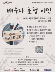 KCWA는 '배우자 초청 이민' 세미나를 4월 25일 (목) 오후 6시부터 줌 (Zoom) 미팅을 통해 진행합니다. 이 세미나에서는 배우자 초청 이민을