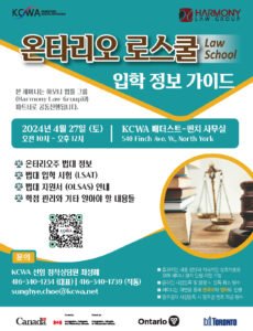 KCWA의 '온타리오 로스쿨(Law School) 입학 정보 가이드' 세미나가 4월 27일 (토) 오전 10시부터 KCWA 배더스트-핀치 사무실 (540 Finch Ave. W.,