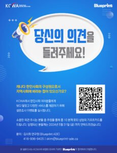 캐나다 한인사회의 구성원으로서 지역사회에 바라는 점이 있으신가요? KCWA에서 한인사회 여러분들에게 보다 알맞고 다양한 서비스를 제공하기 위해 설문조사 이벤트를 실시합니다. 지역사회의