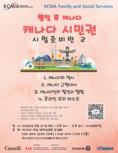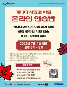 안녕하세요? KCWA에서는 캐나다 시민권 시험을 앞둔 분들을 위해 7월 4일 (화) 오후 6시부터 줌(Zoom) 미팅을 통해 '캐나다 시민권 시험 온라인