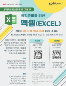 안녕하세요? KCWA에서는 취업준비생이나 신입직원에게 필수적인 컴퓨터 업무 프로그램 '엑셀'에 대한 강좌 '취업준비를 위한 엑셀(Excel)'을 7월 4일 (화)부터 총 4회에 걸쳐