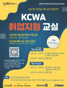 안녕하세요? 성공적인 취업을 위한 실전 취업전략 'KCWA 취업지원 교실'이 7월 6일 (목)과 7일 (금) 오후 3시부터 5시까지 KCWA 배더스트-핀치 사무실(540
