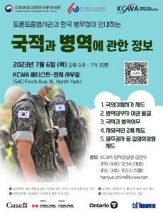 안녕하세요? KCWA에서는 7월 6일 (목) 오후 6시 KCWA 배더스트-핀치 사무실(540 Finch Ave. W., North York)에서 '국적과 병역에 관한 정보' 세미나를