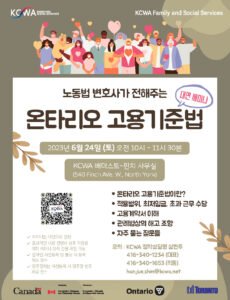안녕하세요? KCWA에서는 6월 24일 (토) 오전 10시부터 '노동법 변호사가 전해주는 온타리오 고용기준법' 강좌를 대면으로 KCWA 배더스트-핀치 사무실(540 Finch Ave. W.,