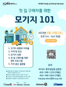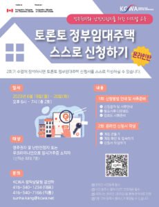 안녕하세요? KCWA는 '토론토 정부임대주택 스스로 신청하기 - 온라인반' 강좌를 줌 (Zoom) 미팅을 통해 6월 19일 (월)과 20일 (화) 오후 6시부터 총