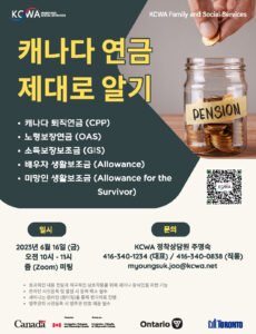 안녕하세요? KCWA에서는 '캐나다 연금 제대로 알기' 강좌를 6월 16일 (금) 오전 10시부터 줌(Zoom) 미팅을 통해 진행합니다. 이 강좌에서는 CPP (캐나다