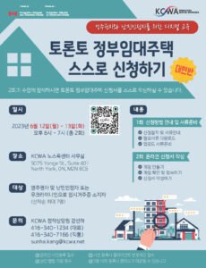 안녕하세요? KCWA에서는 '토론토 정부임대주택 스스로 신청하기' 대면반을 6월 12일(월) & 13일(화) 오후 6시부터 KCWA 노스욕센터 사무실(5075 Yonge St. Suite 401,