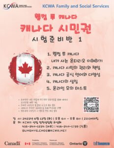 안녕하세요? KCWA의 '캐나다 시민권 시험 준비반' 강좌가 총 3회에 걸쳐 온라인으로 진행됩니다. 첫번째 강좌는 6월 13일 (화) 오후 6시부터 Zoom