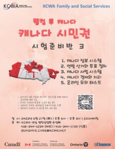 안녕하세요? KCWA에서는 '캐나다 시민권 시험 준비반 3' 강좌를 6월 27일 (화) 오후 6시부터 줌(Zoom) 미팅을 통해 진행합니다. 이번 강좌에서는 캐나다