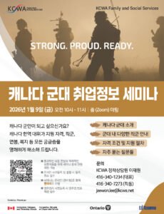 KCWA는 1월 9일 (금) 오전 10시부터 줌 (Zoom) 미팅을 통해 ‘캐나다 군대 취업정보 세미나’를 진행할 예정입니다.